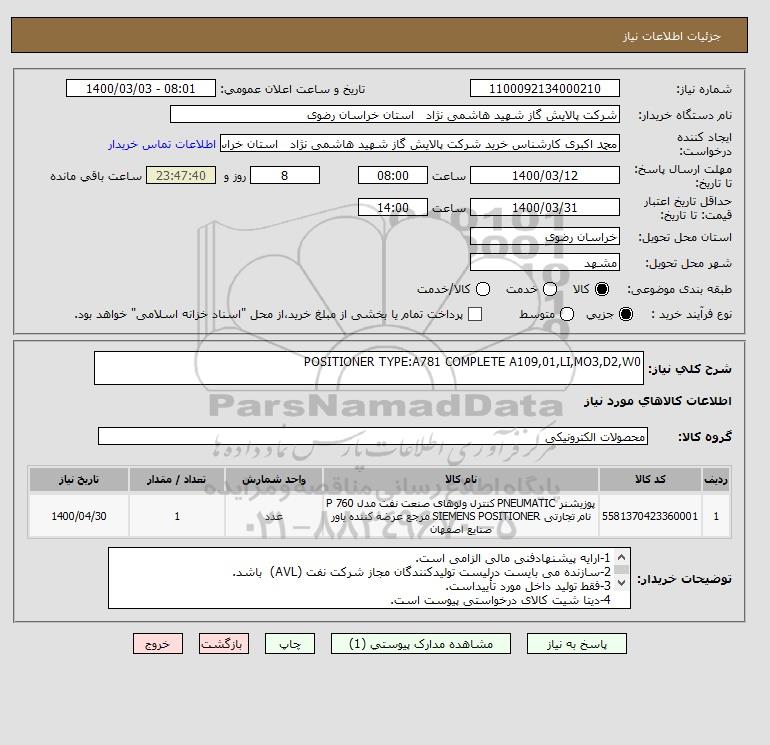 شرح کلی نیاز: POSITIONER TYPE:A781 COMPLETE A109,01,LI,MO3,D2,W0