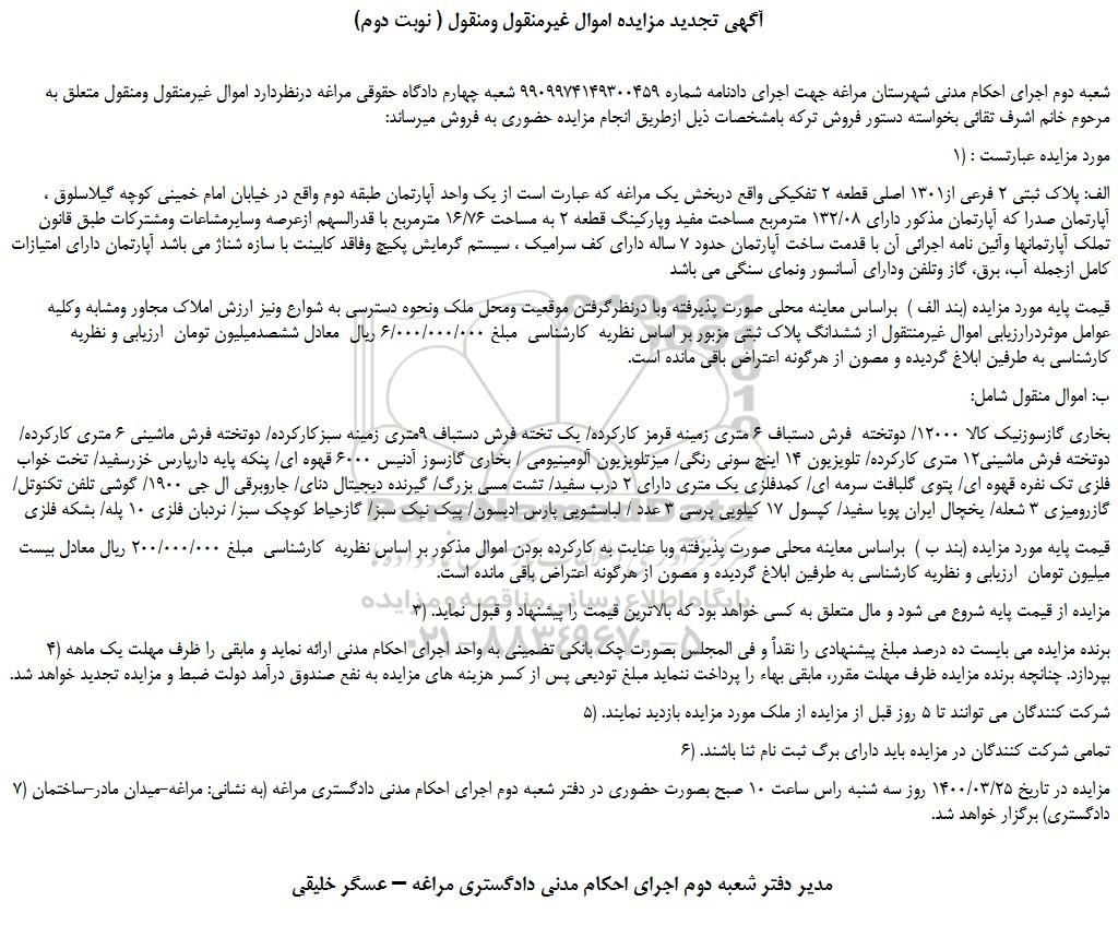 شعبه دوم اجرای احکام مدنی شهرستان مراغه جهت اجرای دادنامه شماره 9909974149300459 شعبه چهارم دادگاه حقوقی مراغه درنظردارد اموال غیرمنقول ومنقول متعلق به مرحوم خانم اشرف تقائی بخواسته دستور فروش ترکه بامشخصات ذیل ازطریق انجام مزایده حضوری به فروش میرساند:
