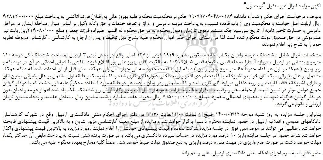 بنابراین جلسه مزایده به روز شنبه مورخه 1400/03/12 صبح از ساعت 11/00لغایت 11/30 در دفتر اجرای احکام مدنی دادگستری اردبیل واقع در شهرک کارشناسان دادگاههای عمومی و انقلاب اردبیل در حضور نماینده محترم دادسرا برگزار خواهد شد و مزایده از مبلغ معینه کارشناسی مزبور شروع و به بالاترین قیمت پیشنهادی فروخته خواهد شد . طالبین می توانند در موعد مقرر فوق در جلسه مزایده شرکت نموده و قیمت پیشنهادی خودشان را اعلام نمایند . مورد مزایده به بالاترین قیمت پیشنهادی واگذار خواهد شد شرط حضور در جلسه مزایده واریز 10 درصد مورد مزایده در حساب سپرده دادگستری می باشد و در صورت برنده شدن نسبت به پرداخت مابقی آن حداکثر یکماه مهلت خواهد داشت در صورت عدم واریزی در مهلت مقرره درصد واریزی به نفع صندوق دولت ضبط خواهد شد . ضمناً کلیه مخارج بعهده محکوم علیه می باشد.