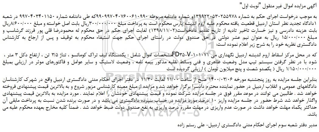 مشخصات اموال شامل : یکدستگاه لیف تراک کوماتسو ، تناژ 3/5 تن ، ارتفاع دکل 3 متر ، FD35-V-101071 که در محل مرکز اسقاط اروم اندیشه اردبیل نگهداری می شود با در نظر گرفتن سیستم تیپ مدل وضعیت ظاهری و فنی وسائط نقلیه مذکور بیمه نامه ، وضعیت لاستیک و سایر عوامل و فاکتورهای موثر در ارزیابی بمبلغ 1/150/000/000 ریال ( یکصدو شصت و پنج میلایون تومان ) ارزیابی گردیده است