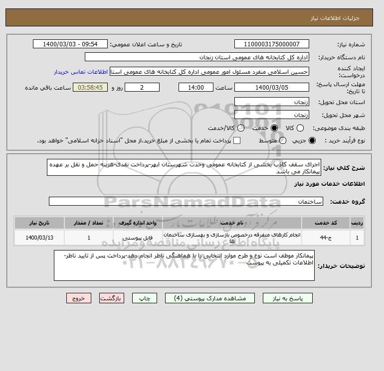 شرح کلی نیاز: اجرای سقف کاذب بخشی از کتابخانه عمومی وحدت شهرستان ابهر-پرداخت نقدی-هزینه حمل و نقل بر عهده پیمانکار می باشد