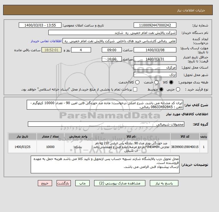 شرح کلی نیاز: ایران کد مشابه می باشد. شرح اصلی درخواست: ماده ضد خوردگی فاین امین 90 - تعداد 10000 کیلوگرم - تلفن : 08633492845 رضائی.