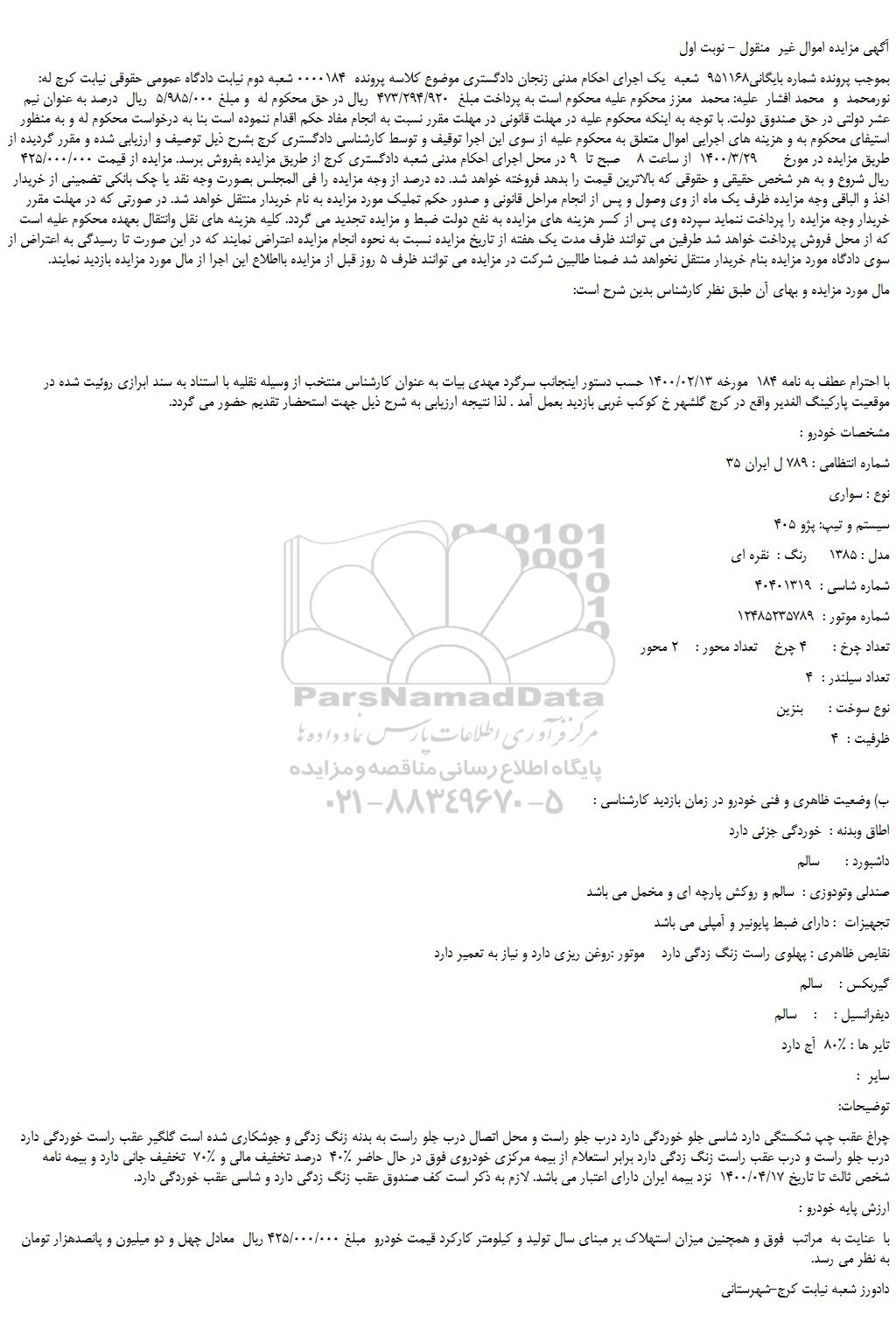 بموجب پرونده شماره بایگانی951168 شعبه یک اجرای احکام مدنی زنجان دادگستری موضوع کلاسه پرونده 0000184 شعبه دوم نیابت دادگاه عمومی حقوقی نیابت کرج له: نورمحمد و محمد افشار علیه: محمد معزز محکوم علیه محکوم است به پرداخت مبلغ 473/294/920 ریال در حق محکوم له و مبلغ 5/985/000 ریال درصد به عنوان نیم عشر دولتی در حق صندوق دولت. با توجه به اینکه محکوم علیه در مهلت قانونی در مهلت مقرر نسبت به انجام مفاد حکم اقدام ننموده است بنا به درخواست محکوم له و به منظور استیفای محکوم به و هزینه های اجرایی اموال متعلق به محکوم علیه از سوی این اجرا توقیف و توسط کارشناسی دادگستری کرج بشرح ذیل توصیف و ارزیابی شده و مقرر گردیده از طریق مزایده در مورخ 1400/3/29 از ساعت 8 صبح تا 9 در محل اجرای احکام مدنی شعبه دادگستری کرج از طریق مزایده بفروش برسد. مزایده از قیمت 425/000/000 ریال شروع و به هر شخص حقیقی و حقوقی که بالاترین قیمت را بدهد فروخته خواهد شد. ده درصد از وجه مزایده را فی المجلس بصورت وجه نقد یا چک بانکی تضمینی از خریدار اخذ و الباقی وجه مزایده ظرف یک ماه از وی وصول و پس از انجام مراحل قانونی و صدور حکم تملیک مورد مزایده به نام خریدار منتقل خواهد شد. در صورتی که در مهلت مقرر خریدار وجه مزایده را پرداخت ننماید سپرده وی پس از کسر هزینه های مزایده به نفع دولت ضبط و مزایده تجدید می گردد. کلیه هزینه های نقل وانتقال بعهده محکوم علیه است که از محل فروش پرداخت خواهد شد طرفین می توانند ظرف مدت یک هفته از تاریخ مزایده نسبت به نحوه انجام مزایده اعتراض نمایند که در این صورت تا رسیدگی به اعتراض از سوی دادگاه مورد مزایده بنام خریدار منتقل نخواهد شد ضمنا طالبین شرکت در مزایده می توانند ظرف 5 روز قبل از مزایده بااطلاع این اجرا از مال مورد مزایده بازدید نمایند.