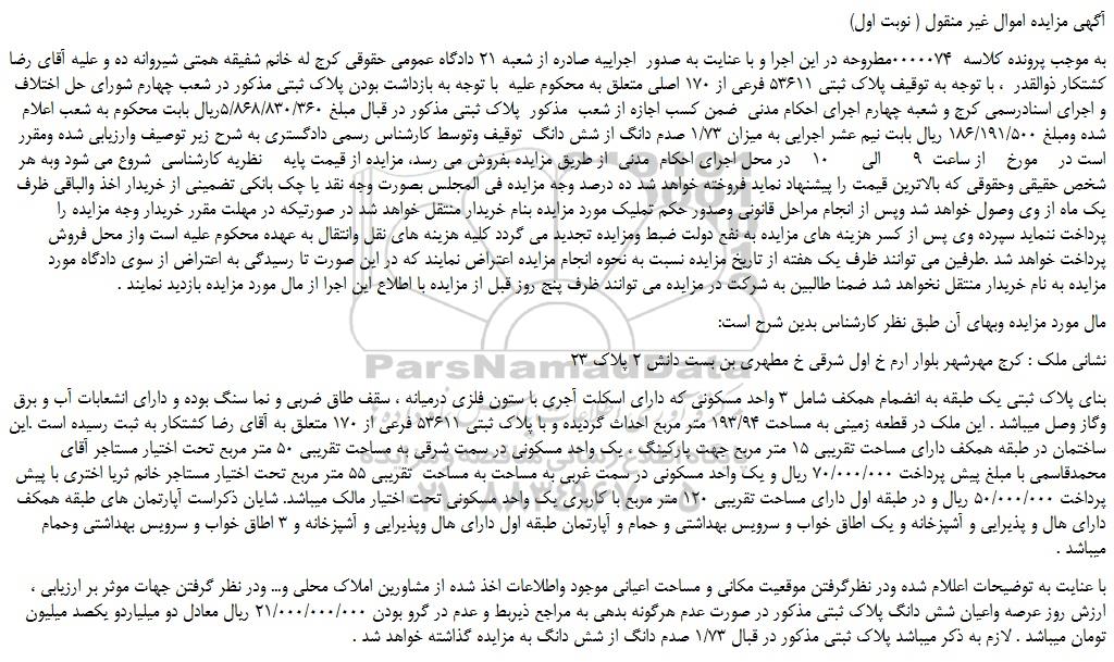 به موجب پرونده کلاسه  0000074مطروحه در این اجرا و با عنایت به صدور  اجراییه صادره از شعبه 21 دادگاه عمومی حقوقی کرج له خانم شفیقه همتی شیروانه ده و علیه آقای رضا کشتکار ذوالقدر  ، با توجه به توقیف پلاک ثبتی 53611 فرعی از 170 اصلی متعلق به محکوم علیه  با توجه به بازداشت بودن پلاک ثبتی مذکور در شعب چهارم شورای حل اختلاف و اجرای اسنادرسمی کرج و شعبه چهارم اجرای احکام مدنی  ضمن کسب اجازه از شعب  مذکور  پلاک ثبتی مذکور در قبال مبلغ 5/868/830/360ریال بابت محکوم به شعب اعلام شده ومبلغ 186/191/500 ریال بابت نیم عشر اجرایی به میزان 1/73 صدم دانگ از شش دانگ  توقیف وتوسط کارشناس رسمی دادگستری به شرح زیر توصیف وارزیابی شده ومقرر است در    مورخ    از ساعت  9      الی      10    در محل اجرای احکام  مدنی  از طریق مزایده بفروش می رسد، مزایده از قیمت پایه    نظریه کارشناسی  شروع می شود وبه هر شخص حقیقی وحقوقی که بالاترین قیمت را پیشنهاد نماید فروخته خواهد شد ده درصد وجه مزایده فی المجلس بصورت وجه نقد یا چک بانکی تضمینی از خریدار اخذ والباقی ظرف یک ماه از وی وصول خواهد شد وپس از انجام مراحل قانونی وصدور حکم تملیک مورد مزایده بنام خریدار منتقل خواهد شد در صورتیکه در مهلت مقرر خریدار وجه مزایده را پرداخت ننماید سپرده وی پس از کسر هزینه های مزایده به نفع دولت ضبط ومزایده تجدید می گردد کلیه هزینه های نقل وانتقال به عهده محکوم علیه است واز محل فروش پرداخت خواهد شد .طرفین می توانند ظرف یک هفته از تاریخ مزایده نسبت به نحوه انجام مزایده اعتراض نمایند که در این صورت تا رسیدگی به اعتراض از سوی دادگاه مورد مزایده به نام خریدار منتقل نخواهد شد ضمنا طالبین به شرکت در مزایده می توانند ظرف پنج روز قبل از مزایده با اطلاع این اجرا از مال مورد مزایده بازدید نمایند .