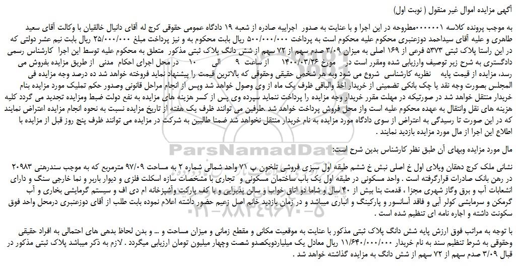 به موجب پرونده کلاسه 0000001مطروحه در این اجرا و با عنایت به صدور اجراییه صادره از شعبه 19 دادگاه عمومی حقوقی کرج له آقای دانیال خالقیان با وکالت آقای سعید طاهری و علیه آقای سیداحمد دوزعنبری محکوم علیه محکوم است به پرداخت 500/000/000 ریال بابت محکوم به و نیز پرداخت مبلغ 25/000/000 ریال بابت نیم عشر دولتی که در این راستا پلاک ثبتی 5373 فرعی از 169 اصلی به میزان 3/09 صدم سهم از 72 سهم از شش دانگ پلاک ثبتی مذکور متعلق به محکوم علیه توسط این اجرا کارشناس رسمی دادگستری به شرح زیر توصیف وارزیابی شده ومقرر است در مورخ 1400/03/26 از ساعت 9 الی 10 در محل اجرای احکام مدنی از طریق مزایده بفروش می رسد، مزایده از قیمت پایه نظریه کارشناسی شروع می شود وبه هر شخص حقیقی وحقوقی که بالاترین قیمت را پیشنهاد نماید فروخته خواهد شد ده درصد وجه مزایده فی المجلس بصورت وجه نقد یا چک بانکی تضمینی از خریدار اخذ والباقی ظرف یک ماه از وی وصول خواهد شد وپس از انجام مراحل قانونی وصدور حکم تملیک مورد مزایده بنام خریدار منتقل خواهد شد در صورتیکه در مهلت مقرر خریدار وجه مزایده را پرداخت ننماید سپرده وی پس از کسر هزینه های مزایده به نفع دولت ضبط ومزایده تجدید می گردد کلیه هزینه های نقل وانتقال به عهده محکوم علیه است واز محل فروش پرداخت خواهد شد .طرفین می توانند ظرف یک هفته از تاریخ مزایده نسبت به نحوه انجام مزایده اعتراض نمایند که در این صورت تا رسیدگی به اعتراض از سوی دادگاه مورد مزایده به نام خریدار منتقل نخواهد شد ضمنا طالبین به شرکت در مزایده می توانند ظرف پنج روز قبل از مزایده با اطلاع این اجرا از مال مورد مزایده بازدید نمایند .