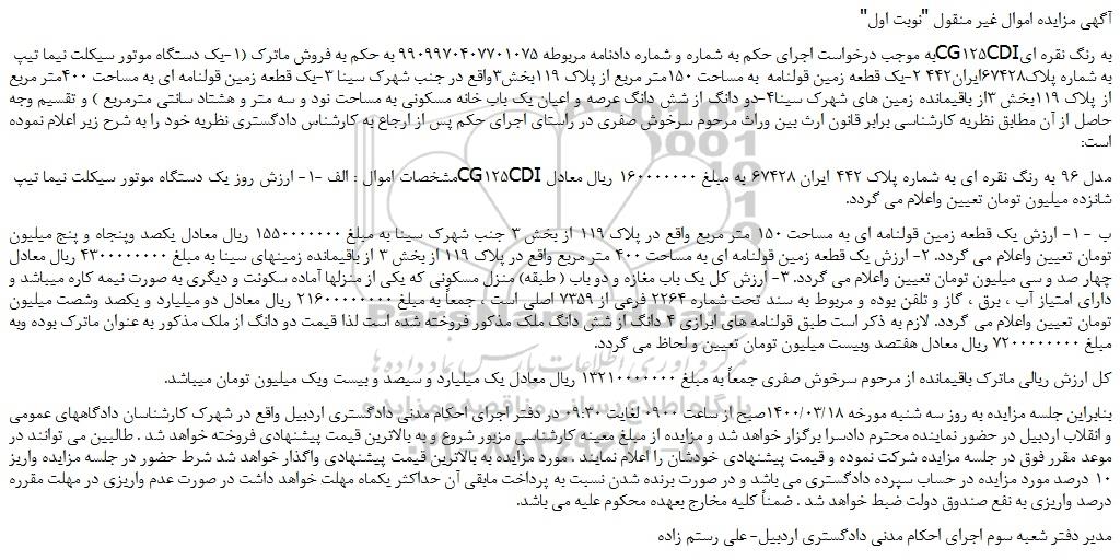 به موجب درخواست اجرای حکم به شماره و شماره دادنامه مربوطه 9909970407701075 به حکم به فروش ماترک (1-یک دستگاه موتور سیکلت نیما تیپ CG125CDIبه رنگ نقره ای به شماره پلاک67428ایران442 2-یک قطعه زمین قولنامه به مساحت 150متر مربع از پلاک 119بخش3واقع در جنب شهرک سینا 3-یک قطعه زمین قولنامه ای به مساحت 400متر مربع از پلاک 119بخش 3از باقیمانده زمین های شهرک سینا4-دو دانگ از شش دانگ عرصه و اعیان یک باب خانه مسکونی به مساحت نود و سه متر و هشتاد سانتی مترمربع ) و تقسیم وجه حاصل از آن مطابق نظریه کارشناسی برابر قانون ارث بین وراث مرحوم سرخوش صفری در راستای اجرای حکم پس از ارجاع به کارشناس دادگستری نظریه خود را به شرح زیر اعلام نموده است: