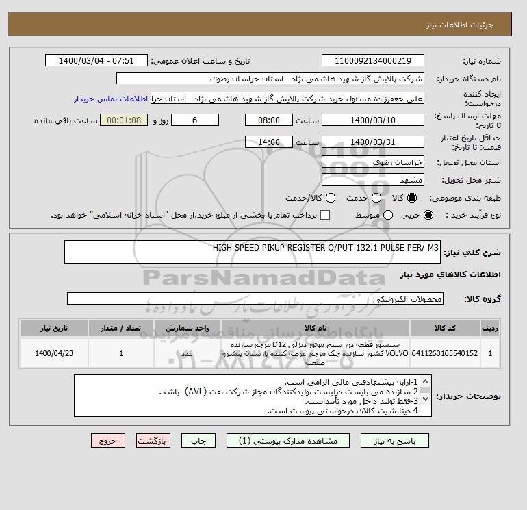 شرح کلی نیاز: HIGH SPEED PIKUP REGISTER O/PUT 132.1 PULSE PER/ M3
