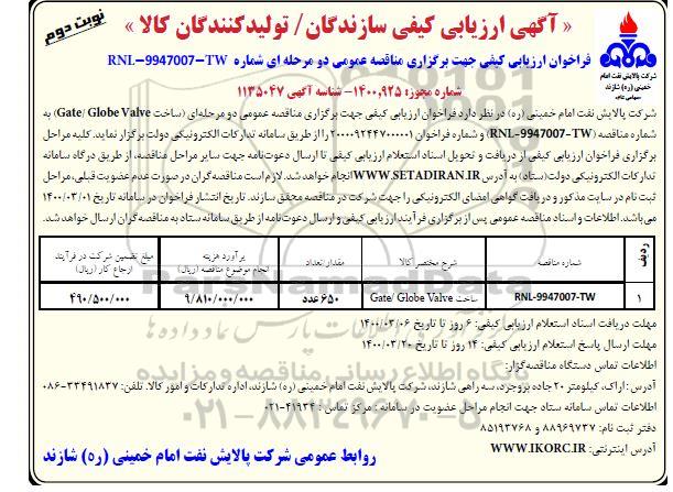 شرکت پالایش نفت امام خمینی (ره) شازند در نظر دارد فراخوان ارزیابی کیفی جهت برگزاری مناقصه عمومی دو مرحله ای (ساخت Gate / Globe valve) به شماره مناقصه (RNL - 9947007- TW) و شماره فراخوان 2000092447000001 را از طریق سامانه تدارکات الکترونیکی دولت برگزار نماید. کلیه مراحل برگزاری فراخوان ارزیابی کیفی از دریافت و تحویل اسناد استعلام ارزیابی کیفی تا ارسال دعوتنامه جهت سایر مراحل مناقصه از طریق درگاه سامانه تدارکات الکترونیکی دولت ستاد به آدرس ستاد ایران انجام خواهد شد. لازم است مناقصه گران در صورت عدم عضویت قبلی مراحل ثبت نام در سایت مذکور و دریافت گواهی امضای الکترونیکی را جهت شرکت در مناقصه محقق سازند. تاریخ انتشار فراخوان در سامانه تاریخ 1400.3.1 می باشد. اطلاعات و اسناد مناقصه عمومی پس از برگزاری فرآیند ارزیابی کیفی و ارسال دعوتنامه از طریق سامانه ستاد به مناقصه گران ارسال خواهد شد.