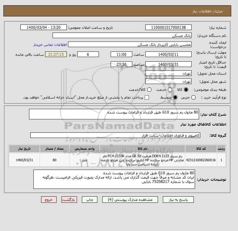 شرح کلی نیاز: 80 مازول رم سرور G10 طبق قرارداد و الزامات پیوست شده