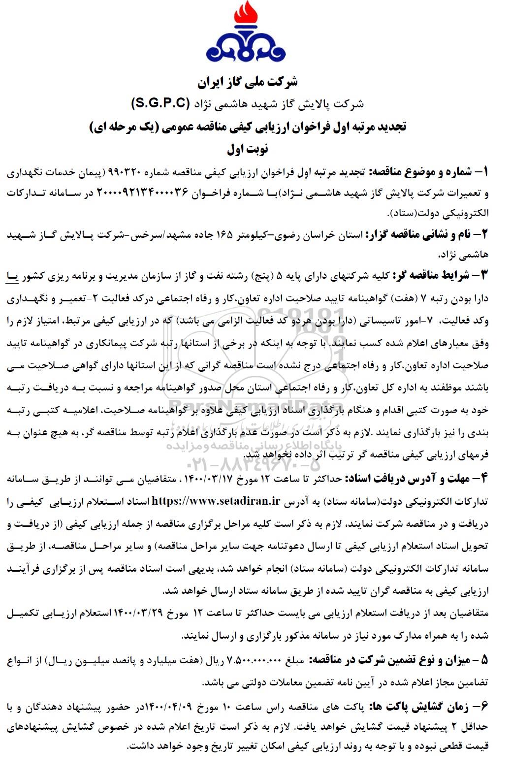 1- شماره و موضوع مناقصه: تجدید مرتبه اول فراخوان ارزیابی کیفی مناقصه شماره 990320 (پیمان خدمات نگهداری و تعمیرات شرکت پالایش گاز شهید هاشمی نژاد) با شماره فراخوان 2000092134000036 در سامانه تدارکات الکترونیکی دولت ستاد