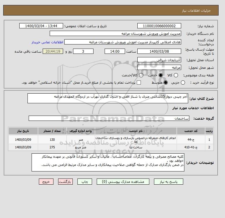 شرح کلی نیاز: آجر چینی دیوار 35سانتی متری با شناژ افقی و جدول گذاری نهرآب در اردوگاه المهدی مراغه