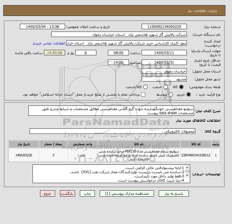 نام دستگاه خریدار:شرکت پالایش گاز شهید هاشمی نژاد استان خراسان رضوی