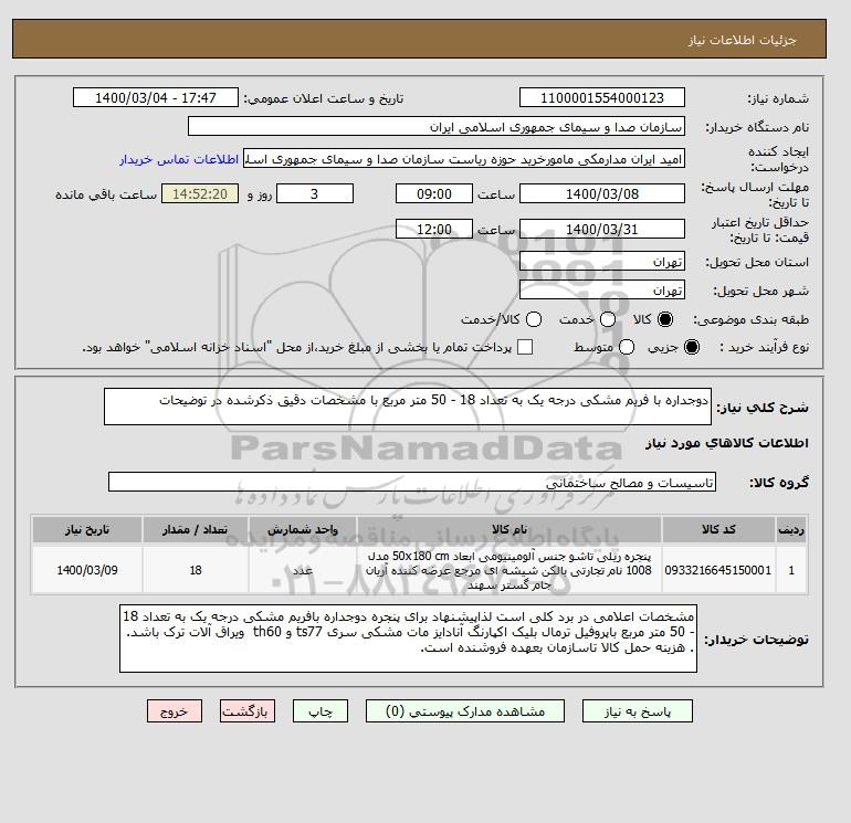 شرح کلی نیاز: دوجداره با فریم مشکی درجه یک به تعداد 18 - 50 متر مربع با مشخصات دقیق ذکرشده در توضیحات