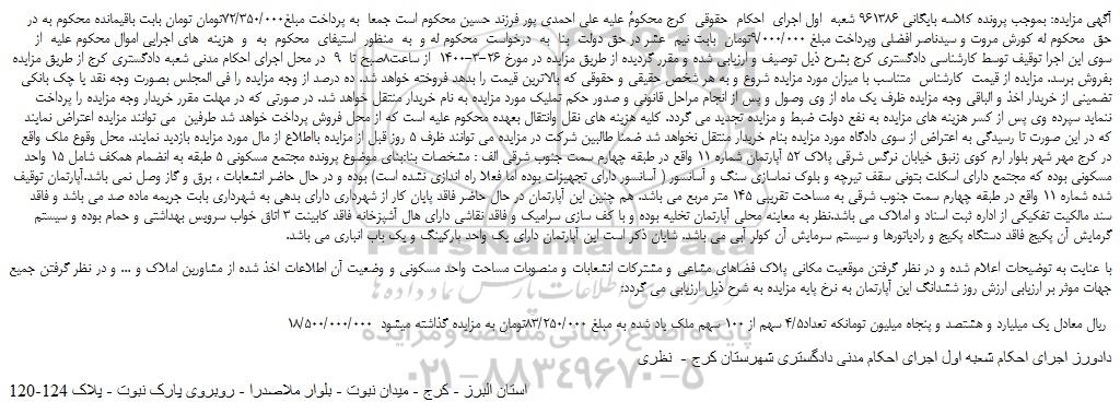 آگهی مزایده: بموجب پرونده کلاسه بایگانی 961386 شعبه  اول اجرای  احکام  حقوقی  کرج محکومٌ علیه علی احمدی پور فرزند حسین محکوم است جمعا  به پرداخت مبلغ72/350/000تومان تومان بابت باقیمانده محکوم به در حق  محکوم له کورش مروت و سیدناصر افضلی وپرداخت مبلغ 9/000/000تومان  بابت نیم  عشر در حق دولت  بنا  به  درخواست  محکوم له و  به  منظور  استیفای  محکوم  به  و  هزینه  های اجرایی اموال محکوم علیه  از سوی این اجرا توقیف توسط کارشناسی دادگستری کرج بشرح ذیل توصیف و ارزیابی شده و مقرر گردیده از طریق مزایده در مورخ 26-3-1400  از ساعت8صبح تا  9  در محل اجرای احکام مدنی شعبه دادگستری کرج از طریق مزایده بفروش برسد. مزایده از قیمت  کارشناس  متناسب با میزان مورد مزایده شروع و به هر شخص حقیقی و حقوقی که بالاترین قیمت را بدهد فروخته خواهد شد. ده درصد از وجه مزایده را فی المجلس بصورت وجه نقد یا چک بانکی تضمینی از خریدار اخذ و الباقی وجه مزایده ظرف یک ماه از وی وصول و پس از انجام مراحل قانونی و صدور حکم تملیک مورد مزایده به نام خریدار منتقل خواهد شد. در صورتی که در مهلت مقرر خریدار وجه مزایده را پرداخت ننماید سپرده وی پس از کسر هزینه های مزایده به نفع دولت ضبط و مزایده تجدید می گردد. کلیه هزینه های نقل وانتقال بعهده محکوم علیه است که از محل فروش پرداخت خواهد شد طرفین  می توانند مزایده اعتراض نمایند که در این صورت تا رسیدگی به اعتراض از سوی دادگاه مورد مزایده بنام خریدار منتقل نخواهد شد ضمنا طالبین شرکت در مزایده می توانند ظرف 5 روز قبل از مزایده بااطلاع از مال مورد مزایده بازدید نمایند. محل وقوع ملک واقع در کرج مهر شهر بلوار ارم کوی زنبق خیابان نرگس شرقی پلاک 52 آپارتمان شماره 11 واقع در طبقه چهارم سمت جنوب شرقی الف : مشخصات بنا:بنای موضوع پرونده مجتمع مسکونی 5 طبقه به انضمام همکف شامل 15 واحد مسکونی بوده که مجتمع دارای اسکلت بتونی سقف تیرچه و بلوک نماسازی سنگ و آسانسور ( آسانسور دارای تجهیزات بوده اما فعلا راه اندازی نشده است) بوده و در حال حاضر انشعابات ، برق و گاز وصل نمی باشد.آپارتمان توقیف شده شماره 11 واقع در طبقه چهارم سمت جنوب شرقی به مساحت تقریبی 145 متر مربع می باشد. هم چنین این آپارتمان در حال حاضر فاقد پایان کار از شهرداری دارای بدهی به شهرداری بابت جریمه ماده صد می باشد و فاقد سند مالکیت تفکیکی از اداره ثبت اسناد و املاک می باشد.نظر به معاینه محلی آپارتمان تخلیه بوده و با کف سازی سرامیک و فاقد نقاشی دارای هال آشپزخانه فاقد کابینت 3 اتاق خواب سرویس بهداشتی و حمام بوده و سیستم گرمایش آن پکیج فاقد دستگاه پکیج و رادیاتورها و سیستم سرمایش آن کولر آبی می باشد. شایان ذکر است این آپارتمان دارای یک واحد پارکینگ و یک باب انباری می باشد.