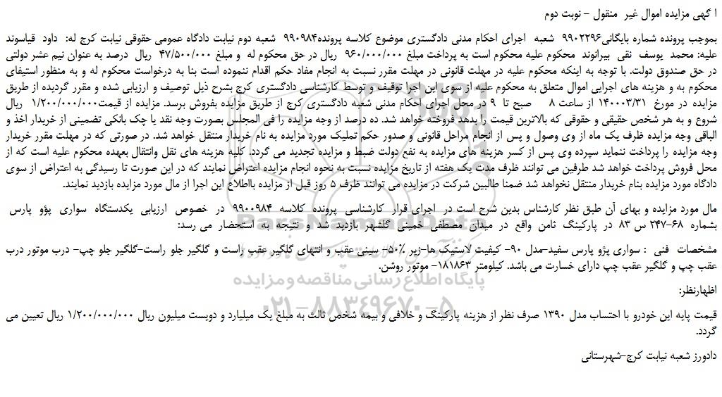 بموجب پرونده شماره بایگانی9902296 شعبه اجرای احکام مدنی دادگستری موضوع کلاسه پرونده990984 شعبه دوم نیابت دادگاه عمومی حقوقی نیابت کرج له: داود قیاسوند علیه: محمد یوسف نقی بیرانوند محکوم علیه محکوم است به پرداخت مبلغ 960/000/000 ریال در حق محکوم له و مبلغ 47/500/000 ریال درصد به عنوان نیم عشر دولتی در حق صندوق دولت. با توجه به اینکه محکوم علیه در مهلت قانونی در مهلت مقرر نسبت به انجام مفاد حکم اقدام ننموده است بنا به درخواست محکوم له و به منظور استیفای محکوم به و هزینه های اجرایی اموال متعلق به محکوم علیه از سوی این اجرا توقیف و توسط کارشناسی دادگستری کرج بشرح ذیل توصیف و ارزیابی شده و مقرر گردیده از طریق مزایده در مورخ 140003/31 از ساعت 8 صبح تا 9 در محل اجرای احکام مدنی شعبه دادگستری کرج از طریق مزایده بفروش برسد. مزایده از قیمت1/200/000/000 ریال شروع و به هر شخص حقیقی و حقوقی که بالاترین قیمت را بدهد فروخته خواهد شد. ده درصد از وجه مزایده را فی المجلس بصورت وجه نقد یا چک بانکی تضمینی از خریدار اخذ و الباقی وجه مزایده ظرف یک ماه از وی وصول و پس از انجام مراحل قانونی و صدور حکم تملیک مورد مزایده به نام خریدار منتقل خواهد شد. در صورتی که در مهلت مقرر خریدار وجه مزایده را پرداخت ننماید سپرده وی پس از کسر هزینه های مزایده به نفع دولت ضبط و مزایده تجدید می گردد. کلیه هزینه های نقل وانتقال بعهده محکوم علیه است که از محل فروش پرداخت خواهد شد طرفین می توانند ظرف مدت یک هفته از تاریخ مزایده نسبت به نحوه انجام مزایده اعتراض نمایند که در این صورت تا رسیدگی به اعتراض از سوی دادگاه مورد مزایده بنام خریدار منتقل نخواهد شد ضمنا طالبین شرکت در مزایده می توانند ظرف 5 روز قبل از مزایده بااطلاع این اجرا از مال مورد مزایده بازدید نمایند.