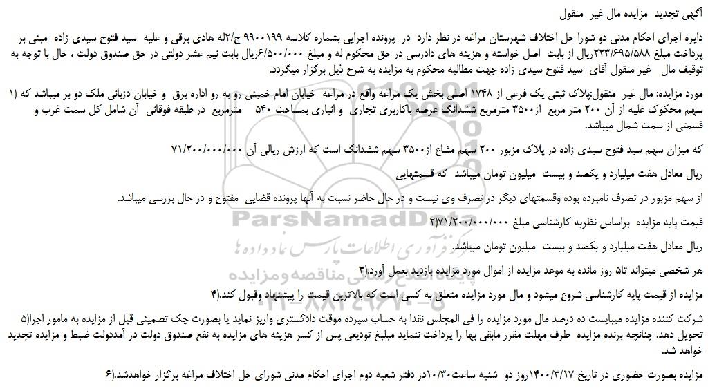 دایره اجرای احکام مدنی دو شورا حل اختلاف شهرستان مراغه در نظر دارد  در  پرونده اجرایی بشماره کلاسه 9900199 ج/2له هادی برقی و علیه  سید فتوح سیدی زاده  مبنی بر پرداخت مبلغ 223/695/588ریال از بابت  اصل خواسته و هزینه های دادرسی در حق محکوم له و مبلغ 6/500/000ریال بابت نیم عشر دولتی در حق صندوق دولت ، حال با توجه به توقیف مال   غیر منقول آقای  سید فتوح سیدی زاده جهت مطالبه محکوم به مزایده به شرح ذیل برگزار میگردد.