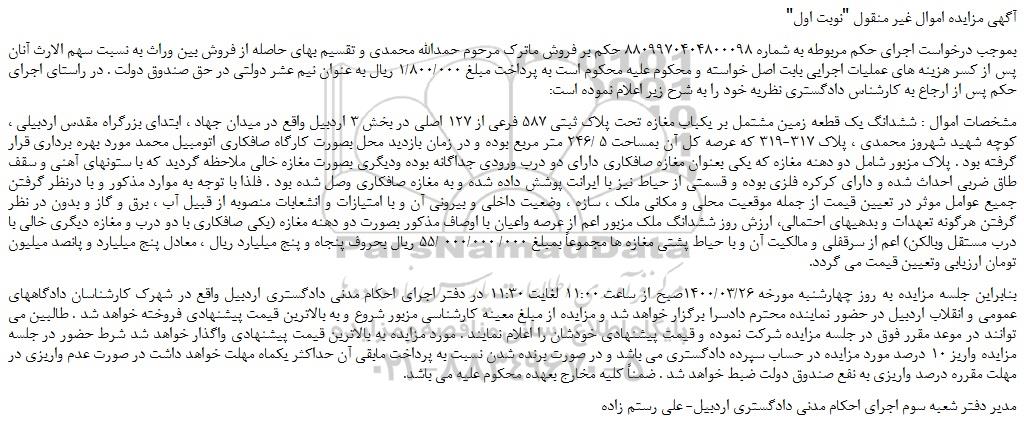 "آگهی مزایده اموال غیر منقول "نوبت اول