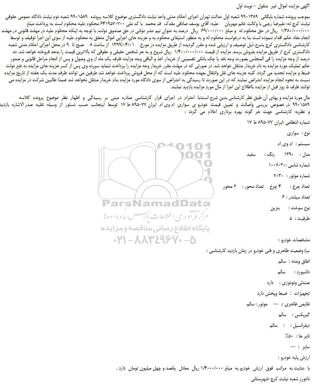 مال مورد مزایده و بهای آن طبق نظر کارشناس بدین شرح است:با  احترام  در  اجرای  قرار  کارشناسی  صادره  مبنی  بر  رسیدگی  و  اظهار  نظر  موضوع  پرونده  کلاسه 9901589  در خصوص  بررسی  واصالت  و  تعیین  قیمت  خودرو ی  سواری  ام وی ام  ایران 77-895 ط 17  توسط  اینجانب  حسب  دستور  از  وسیله  نقلیه  صدر الاشاره  بازدید  نموده  و  نظریه  کارشناسی  جهت  هر  گونه  بهره  برداری  اعلام  می  گردد  :