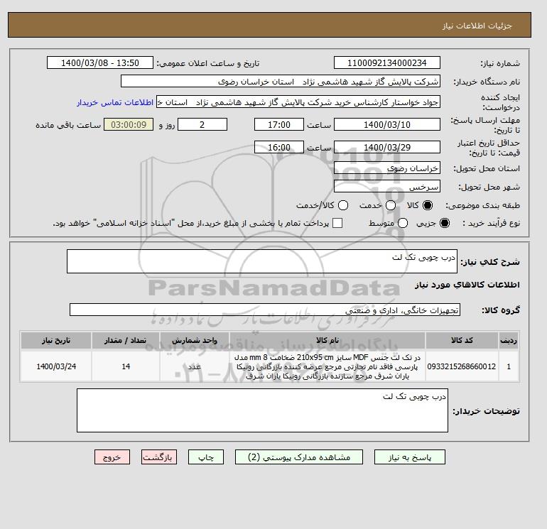 نام دستگاه خریدار:شرکت پالایش گاز شهید هاشمی نژاد استان خراسان رضوی