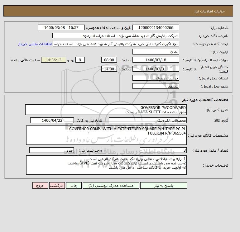 نام دستگاه خریدار:شرکت پالایش گاز شهید هاشمی نژاد استان خراسان رضوی