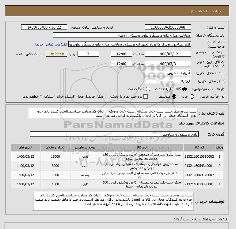 شرح کلی نیاز: ست سرم،میکروست،ست خون معمولی،ست خون دوراهی، ایران کد معادل میباشد،تامین کننده باید جزو توزیع کنندگان مجاز این کالا در Imed باشد،برند ایرانی مد نظر است