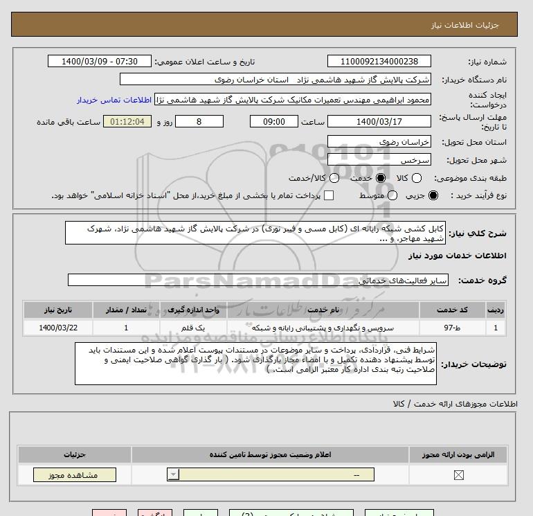 شرح کلی نیاز: کابل کشی شبکه رایانه ای (کابل مسی و فیبر نوری) در شرکت پالایش گاز شهید هاشمی نژاد، شهرک شهید مهاجر، و ...