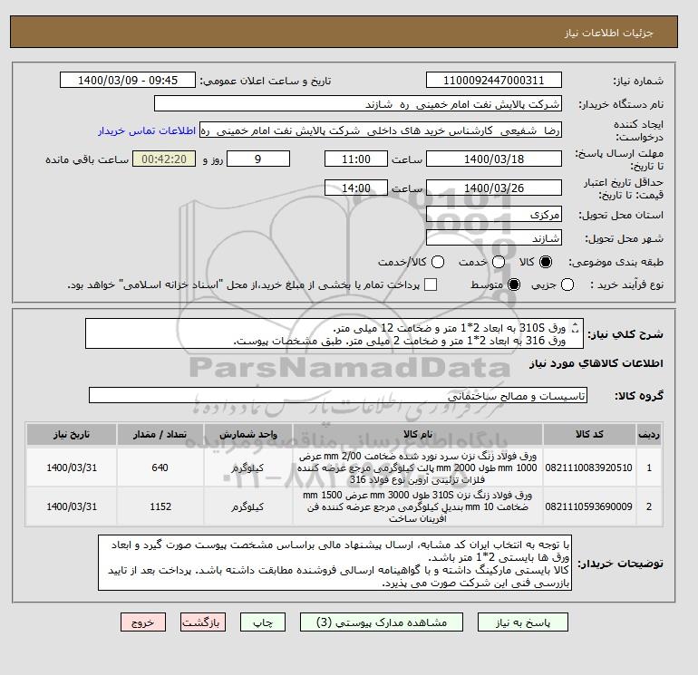 شرح کلی نیاز: ورق 310S به ابعاد 2*1 متر و ضخامت 12 میلی متر. ورق 316 به ابعاد 2*1 متر و ضخامت 2 میلی متر. طبق مشخصات پیوست. ایران کدهای اعلامی مشابه می باشد.