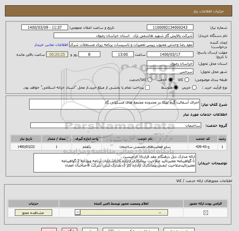 شرح کلی نیاز: اجرای آسفالت گرم توپکا در محدوده مجتمع های مسکونی گاز