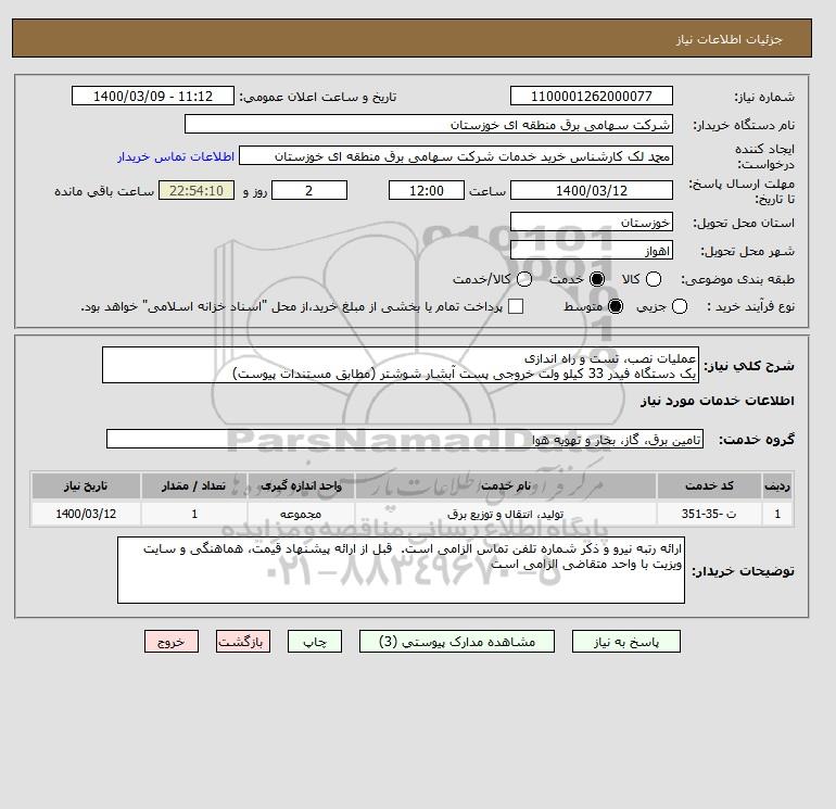 استعلام عملیات نصب، تست و راه اندازی یک دستگاه فیدر 33 کیلو ولت خروجی پست آبشار شوشتر (مطابق مستندات پیوست), استعلام عملیات نصب، تست و راه اندازی یک دستگاه فیدر 33 کیلو ولت خروجی پست آبشار شوشتر (مطابق مستندات پیوست)