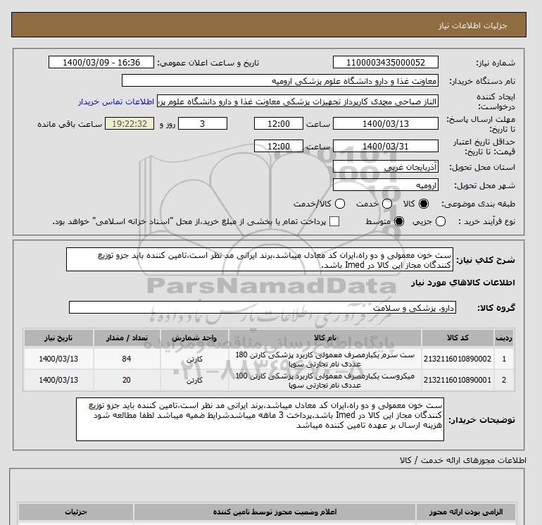 شرح کلی نیاز: ست خون معمولی و دو راه،ایران کد معادل میباشد،برند ایرانی مد نظر است،تامین کننده باید جزو توزیع کنندگان مجاز این کالا در Imed باشد.