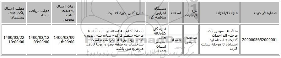 | 2000005652000001 | مناقصه عمومی یک مرحله ای احداث کتابخانه استاندارد اسدآباد تا مرحله سفت کاری | مناقصه عمومی | همدان | اداره کل کتابخانه های عمومی استان همدان | احداث کتابخانه استاندارد اسدآباد تا مرحله سفت کاری - سازه بتنی بوده و فنداسیون نیز قبلا اجرا شده است ساختمان دو طبقه بوده و زیربنا 1200 مترمربع می باشد | 1400/03/09 16:00:00 | 1400/03/12 09:00:00 | 1400/03/22 10:00:00 |