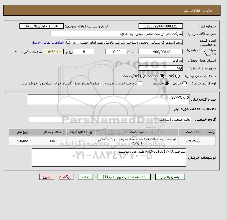 استعلام بها و موضوع استعلام استعلام SUPPORTS به اطلاع کلیه شرکت‌ها و افراد متخصص واجد شرایط می‌رساند، آگهی گذار در نظر دارد از طریق استعلام بها، نسبت به انتخاب و دریافت پیشنهادات اقدام نماید. این استعلام با کد آگهی ثبت شده در سامانه خبرگزاری پارس نماد : 3458822 منتشر شده است. مشخصات استعلام : تاریخ شروع استعلام: 1400/03/09 آخرین مهلت ارسال پیشنهاد قیمت : 1400/03/17 و محل اجرای پروژه : استان مرکزی میباشد. استعلام قیمت مورد درخواست : استعلام SUPPORTS با دسته‌بندی‌های تخصصی و گروه های مرتبط : سازه های فلزی و فضایی, تجهیزات نفت و گاز, استعلام اطلاع رسانی میگردد.