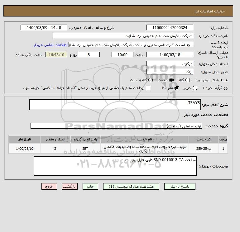 استعلام بها و موضوع استعلام استعلام TRAYS به اطلاع کلیه شرکتها و افراد متخصص واجد شرایط میرساند، آگهی گذار در نظر دارد از طریق استعلام بها، نسبت به انتخاب و دریافت پیشنهادات اقدام نماید. این استعلام با کد آگهی ثبت شده در سامانه خبرگزاری پارس نماد : 3458851 منتشر شده است. مشخصات استعلام : تاریخ شروع استعلام: 1400/03/09 آخرین مهلت ارسال پیشنهاد قیمت : 1400/03/17 و محل اجرای پروژه : استان مرکزی میباشد. استعلام قیمت مورد درخواست : استعلام TRAYS با دستهبندیهای تخصصی و گروه های مرتبط : صنایع حرارتی و برودتی, شیرآلات, برج های تقطیر،مخازن تحت فشار و مبدل های حرارتی, تجهیزات نفت و گاز, استعلام اطلاع رسانی میگردد.