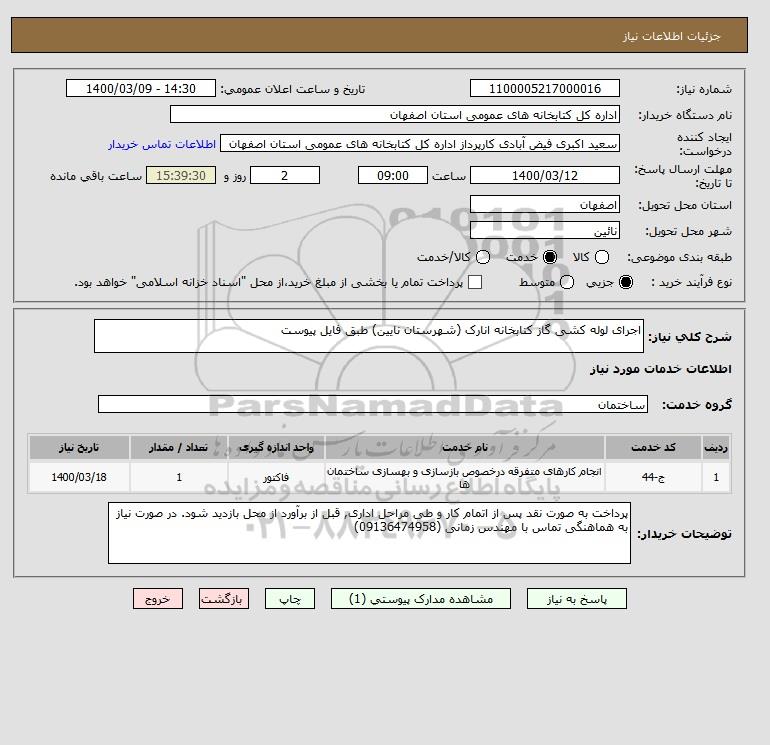 شرح کلی نیاز: اجرای لوله کشی گاز کتابخانه انارک (شهرستان نایین) طبق فایل پیوست