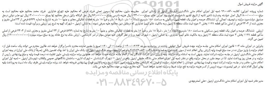 شماره پرونده اجرایی: کلاسه 9900860 شعبه اول اجرای احکام مدنی دادگستری شهرستان اردبیل در راستای اجرای  مطروحه مابین، محکوم لها: سیمین نعمتی فرزند فرض اله محکوم علیه :تهراج خدایاری  فرزند محمد محکوم علیه محکوم است به مبلغ2/800/000/000ریال اصل خواسته وخسارت تاخیر تادیه از تاریخ تقدیم دادخواست لغایت یوم اجرای حکم ،ومبلغ1/340/000ریال هزینه دادرسی ومبلغ96/000/000ریال حق الوکاله وکیل درحق محکوم لها ومبلغ 140/000/000ریال نیم عشر دولتی درحق صندوق دولت،مورد مزایده و توصیف اجمالی آن: ششدانگ عرصه و اعیان یک قطعه زمین مسکونی به مساحت 180 مترمربع (شمالاً 10 متر ، شرقاً 18 متر و غرباً 18 متر به قطعات تفکیکی مجاور و جنوباً 10 متر به شارع) به شماره 5779 فرعی از 34 اصلی مفروز و مجزی شده از 3404 فرعی از اصلی مذکور قطعه 1199 بخش 3 حوزه ثبت ملک منطقه 2 اردبیل و به مالکیت خانم کیمیا خدایاری که درمقابل دین محکوم علیه معرفی نموده ، به نشانی: اردبیل - شهرک الهیه به شرح زیر ارزیابی و برآورد قیمت شده است؛
