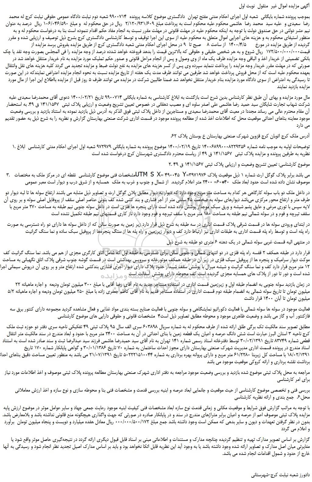 بموجب پرونده شماره بایگانی شعبه اول اجرای احکام مدنی مفتح تهران دادگستری موضوع کلاسه پرونده 9900714 شعبه دوم نیابت دادگاه عمومی حقوقی نیابت کرج له محمد رضا سعیدی و علیه سید محمد رضا هاشمی محکوم علیه محکوم است به پرداخت مبلغ 2/120/931/609 ریال در حق محکوم له و مبلغ 106/046/590 ریال درصد به عنوان نیم عشر دولتی در حق صندوق دولت با توجه به اینکه محکوم علیه در مهلت قانونی در مهلت مقرر نسبت به انجام مفاد حکم اقدام ننموده است بنا به درخواست محکوم له و به منظور استیفای محکوم به و هزینه های اجرایی اموال متعلق به محکوم علیه از سوی این اجرا توقیف و توسط کارشناسی دادگستری کرج بشرح ذیل توصیف و ارزیابی شده و مقرر گردیده از طریق مزایده در مورخ 1400/4/5 از ساعت 8 صبح تا 9 در محل اجرای احکام مدنی شعبه دادگستری کرج از طریق مزایده بفروش برسد مزایده از قیمت172/500/000/000 ریال شروع و به هر شخص حقیقی و حقوقی که بالاترین قیمت را بدهد فروخته خواهد شدده درصد از وجه مزایده را فی المجلس بصورت وجه نقد یا چک بانکی تضمینی از خریدار اخذ و الباقی وجه مزایده ظرف یک ماه از وی وصول و پس از انجام مراحل قانونی و صدور حکم تملیک مورد مزایده به نام خریدار منتقل خواهد شد در صورتی که در مهلت مقرر خریدار وجه مزایده را پرداخت ننماید سپرده وی پس از کسر هزینه های مزایده به نفع دولت ضبط و مزایده تجدید می گردد کلیه هزینه های نقل وانتقال بعهده محکوم علیه است که از محل فروش پرداخت خواهد شد طرفین می توانند ظرف مدت یک هفته از تاریخ مزایده نسبت به نحوه انجام مزایده اعتراض نمایندکه در این صورت تا رسیدگی به اعتراض از سوی دادگاه مورد مزایده بنام خریدار منتقل نخواهد شد ضمنا طالبین شرکت در مزایده می توانند ظرف 5 روز قبل از مزایده بااطلاع این اجرا از مال مورد مزایده بازدید نمایند