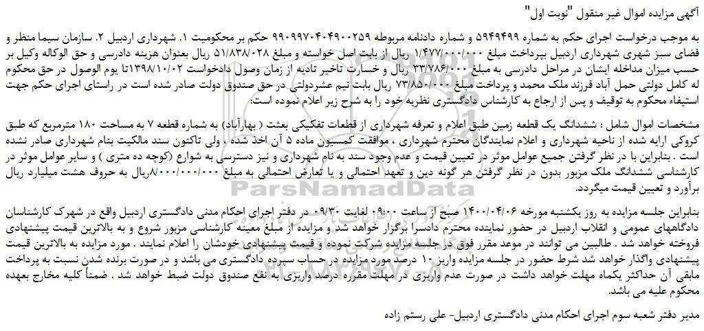 به موجب درخواست اجرای حکم به شماره 5949499 و شماره دادنامه مربوطه 9909970404900259 حکم بر محکومیت 1. شهرداری اردبیل 2. سازمان سیما منظر و فضای سبز شهری شهرداری اردبیل بپرداخت مبلغ 1/477/000/000 ریال از بابت اصل خواسته و مبلغ 51/838/028 ریال بعنوان هزینه دادرسی و حق الوکاله وکیل بر حسب میزان مداخله ایشان در مراحل دادرسی به مبلغ 33/786/000 ریال و خسارت تاخیر تادیه از زمان وصول دادخواست 1398/10/02تا یوم الوصول در حق محکوم له کامل دولتی حمل آباد فرزند ملک محمد و پرداخت مبلغ 73/850/000 ریال بابت نیم عشردولتی در حق صندوق دولت صادر شده است در راستای اجرای حکم جهت استیفاء محکوم به توقیف و پس از ارجاع به کارشناس دادگستری نظریه خود را به شرح زیر اعلام نموده است: