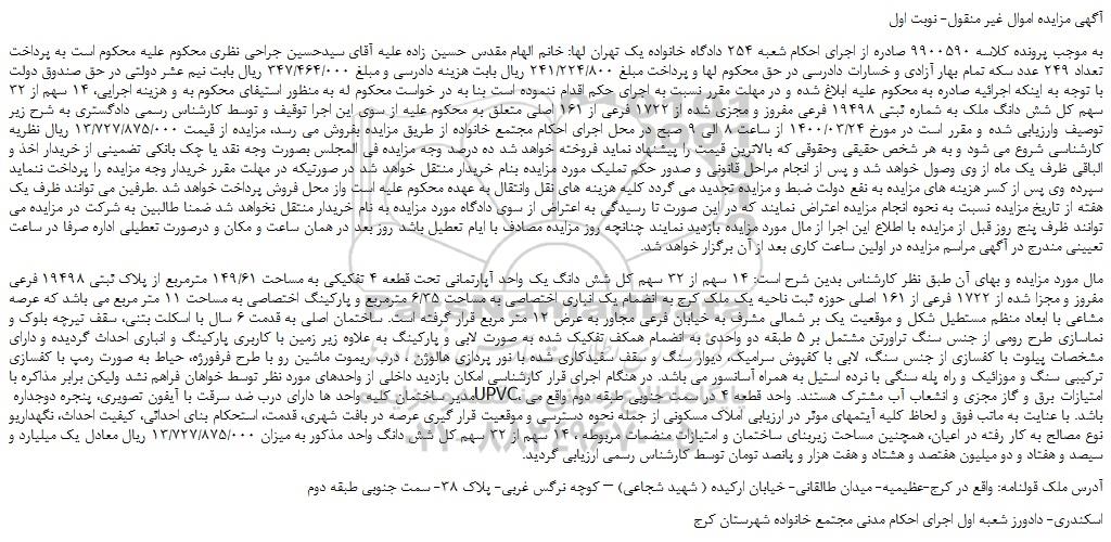 به موجب پرونده کلاسه 9900590 صادره از اجرای احکام شعبه 254 دادگاه خانواده یک تهران لها: خانم الهام مقدس حسین زاده علیه آقای سیدحسین جراحی نظری محکوم علیه محکوم است به پرداخت تعداد 249 عدد سکه تمام بهار آزادی و خسارات دادرسی در حق محکوم لها و پرداخت مبلغ 241/224/800 ریال بابت هزینه دادرسی و مبلغ 347/464/000 ریال بابت نیم عشر دولتی در حق صندوق دولت با توجه به اینکه اجرائیه صادره به محکوم علیه ابلاغ شده و در مهلت مقرر نسبت به اجرای حکم اقدام ننموده است بنا به در خواست محکوم له به منظور استیفای محکوم به و هزینه اجرایی، 14 سهم از 32 سهم کل شش دانگ ملک به شماره ثبتی 19498 فرعی مفروز و مجزی شده از 1722 فرعی از 161 اصلی متعلق به محکوم علیه از سوی این اجرا توقیف و توسط کارشناس رسمی دادگستری به شرح زیر توصیف وارزیابی شده و مقرر است در مورخ 1400/03/24 از ساعت 8 الی 9 صبح در محل اجرای احکام مجتمع خانواده از طریق مزایده بفروش می رسد، مزایده از قیمت 13/727/875/000 ریال نظریه کارشناسی شروع می شود و به هر شخص حقیقی وحقوقی که بالاترین قیمت را پیشنهاد نماید فروخته خواهد شد ده درصد وجه مزایده فی المجلس بصورت وجه نقد یا چک بانکی تضمینی از خریدار اخذ و الباقی ظرف یک ماه از وی وصول خواهد شد و پس از انجام مراحل قانونی و صدور حکم تملیک مورد مزایده بنام خریدار منتقل خواهد شد در صورتیکه در مهلت مقرر خریدار وجه مزایده را پرداخت ننماید سپرده وی پس از کسر هزینه های مزایده به نفع دولت ضبط و مزایده تجدید می گردد کلیه هزینه های نقل وانتقال به عهده محکوم علیه است واز محل فروش پرداخت خواهد شد .طرفین می توانند ظرف یک هفته از تاریخ مزایده نسبت به نحوه انجام مزایده اعتراض نمایند که در این صورت تا رسیدگی به اعتراض از سوی دادگاه مورد مزایده به نام خریدار منتقل نخواهد شد ضمنا طالبین به شرکت در مزایده می توانند ظرف پنج روز قبل از مزایده با اطلاع این اجرا از مال مورد مزایده بازدید نمایند چنانچه روز مزایده مصادف با ایام تعطیل باشد روز بعد در همان ساعت و مکان و درصورت تعطیلی اداره صرفا در ساعت تعیینی مندرج در آگهی مراسم مزایده در اولین ساعت کاری بعد از آن برگزار خواهد شد.