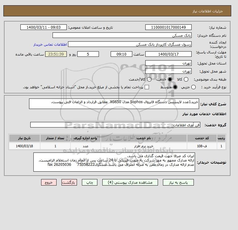 استعلام خرید1عدد لایسنس دستگاه فایروال Sophos مدل XG650 مطابق قرارداد و الزامات فنی پیوست., استعلام خرید1عدد لایسنس دستگاه فایروال Sophos مدل XG650 مطابق قرارداد و الزامات فنی پیوست.