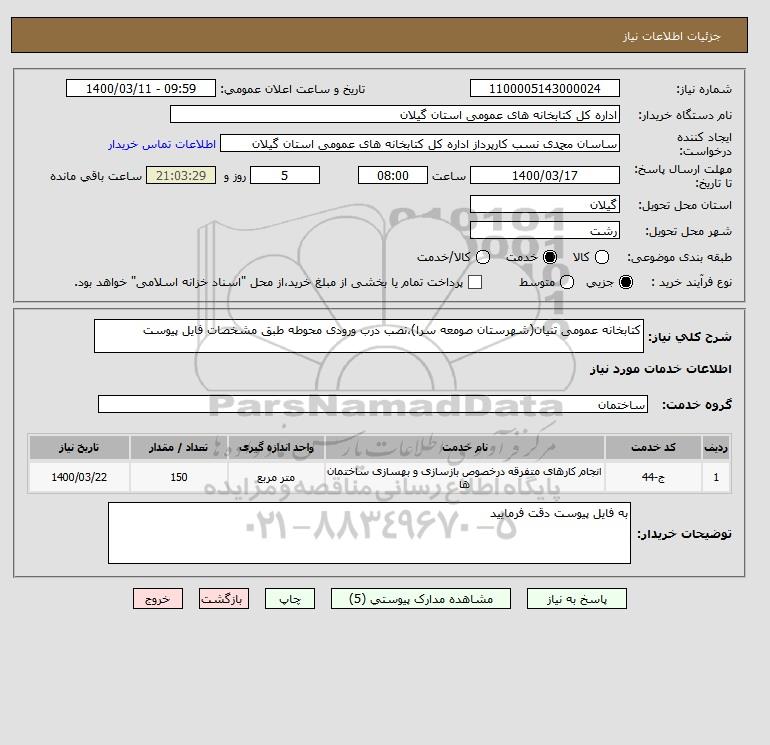 شرح کلی نیاز: کتابخانه عمومی تنیان(شهرستان صومعه سرا)،نصب درب ورودی محوطه طبق مشخصات فایل پیوست