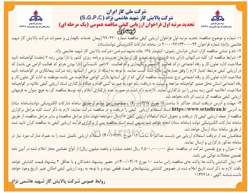 1- شماره و موضوع مناقصه: تجدید مرتبه اول فراخوان ارزیابی کیفی مناقصه شماره 990320 (پیمان خدمات نگهداری و تعمیرات شرکت پالایش گاز شهید هاشمی نژاد) با شماره فراخوان 2000092134000036 در سامانه تدارکات الکترونیکی دولت ستاد