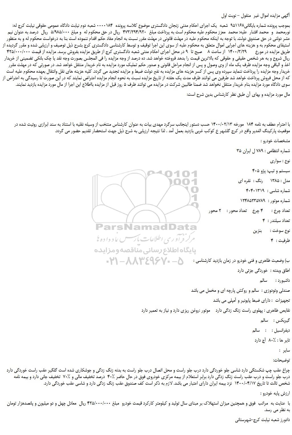 بموجب پرونده شماره بایگانی951168 شعبه یک اجرای احکام مدنی زنجان دادگستری موضوع کلاسه پرونده 0000184 شعبه دوم نیابت دادگاه عمومی حقوقی نیابت کرج له: نورمحمد و محمد افشار علیه: محمد معزز محکوم علیه محکوم است به پرداخت مبلغ 473/294/920 ریال در حق محکوم له و مبلغ 5/985/000 ریال درصد به عنوان نیم عشر دولتی در حق صندوق دولت. با توجه به اینکه محکوم علیه در مهلت قانونی در مهلت مقرر نسبت به انجام مفاد حکم اقدام ننموده است بنا به درخواست محکوم له و به منظور استیفای محکوم به و هزینه های اجرایی اموال متعلق به محکوم علیه از سوی این اجرا توقیف و توسط کارشناسی دادگستری کرج بشرح ذیل توصیف و ارزیابی شده و مقرر گردیده از طریق مزایده در مورخ 1400/3/29 از ساعت 8 صبح تا 9 در محل اجرای احکام مدنی شعبه دادگستری کرج از طریق مزایده بفروش برسد. مزایده از قیمت 425/000/000 ریال شروع و به هر شخص حقیقی و حقوقی که بالاترین قیمت را بدهد فروخته خواهد شد. ده درصد از وجه مزایده را فی المجلس بصورت وجه نقد یا چک بانکی تضمینی از خریدار اخذ و الباقی وجه مزایده ظرف یک ماه از وی وصول و پس از انجام مراحل قانونی و صدور حکم تملیک مورد مزایده به نام خریدار منتقل خواهد شد. در صورتی که در مهلت مقرر خریدار وجه مزایده را پرداخت ننماید سپرده وی پس از کسر هزینه های مزایده به نفع دولت ضبط و مزایده تجدید می گردد. کلیه هزینه های نقل وانتقال بعهده محکوم علیه است که از محل فروش پرداخت خواهد شد طرفین می توانند ظرف مدت یک هفته از تاریخ مزایده نسبت به نحوه انجام مزایده اعتراض نمایند که در این صورت تا رسیدگی به اعتراض از سوی دادگاه مورد مزایده بنام خریدار منتقل نخواهد شد ضمنا طالبین شرکت در مزایده می توانند ظرف 5 روز قبل از مزایده بااطلاع این اجرا از مال مورد مزایده بازدید نمایند.
