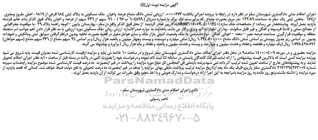 اجرای احکام مدنی دادگستری شهرستان سقز در نظر دارد در رابطه با پرونده اجرائی بکلاسه 0000273، ارزیابی شش دانگ مشاع عرصه واعیان ملک مسکونی به پلاک ثبتی 684 فرعی از 1819- اصلی مفروز ومجزی از674 -بخش ثبتی یک سقز به مساحت 122/89 متر مربع بصورت مشاع که برابر سند تک برگ با شماره سریال ( 604899 ب 97 ) - 96 سهم از 336 سهم از عرصه و اعیان پلاک فوق الذکر بنام خانم فرشته یادگارپور صادر گردیده از محل فوق الذکر واقع در سقز- بهارستان پایین –کوچه راهنما پلاک 29 -با موقعیت جغرافیایی utm(615052-4011240) بازدید بعمل آورده وباستحضار می رساند: از مشخصات ملک سازه از مصالح سنتی و کاملاً فرسوده و کلنگی و غیر قابل سکونت -ودارای امتیازات آب و برق و گاز می باشد. باعنایت به موارد صدرالاشاره ارزش ریالی ملک مسکونی مورد ارزیابی با مد نظر قرار دادن اهم جوانب امر منجمله منطقه و موقعیت قرارگیری مساحت عرصه معبر – دهنه – اعیانی کلنگی -نوع دسترسی به ملک وضعیت کنونی بازار ملک و سایر عوامل دخیل در قضیه بصورت تخلیه وبدون درنظرگرفتن سوابق ثبتی ومالکیتی و تعهدات ودیون بر اساس ریز جدول پیوستی بر اساس شش دانگ مشاع 6.224.500.000 ریال( شش میلیارد و دویست و بیست وچهار میلیون و پانصد هزار ریال) و بر اساس 96 سهم مشاع از 336 سهم مشاع (سهم خواهان) 1.778.428.571 ریال (یک میلیارد و هفتصد و هفتاد و هشت میلیون و چهارصد و بیست و هشت میلیون و پانصد و هفتاد و یک هزار ریال ) برآورد و پیشنهاد می گردد.