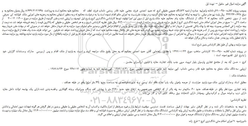 بموجب پرونده کلاسه 9900450و دادنامه واجراییه صادره از شعبه 23دادگاه عمومی حقوقی کرج له: حمید احمدی فرزند مجتبی علیه : قادر رستمی دامناب فرزند لطف اله محکوم علیه محکوم است به پرداخت 8/669/212/765 ریال بعنوان محکوم به و مبلغ 433/460/638 ریال بابت نیم عشر دولتی . با توجه به اینکه اجراییه به محکوم علیه ابلاغ گردیده و در مهلت مقررنسبت به اجرای حکم اقدام ننموده است بنا به درخواست محکوم له و به منظور استیفای محکوم به و هزینه های اجرایی ملک قولنامه ای معرفی شده از سوی شخص ثالث محکوم له 3 دانگ از ششدانگ مغازه بنام محکوم علیه ملک بشرح ذیل از سوی این اجرا توقیف توسط کارشناسی دادگستری کرج بشرح ذیل توصیف و ارزیابی شده و مقرر گردیده از طریق مزایده در مورخ 1400/ 3 / 30 از ساعت 9 الی 10 صبح در محل اجرای احکام مدنی شعبه دادگستری کرج از طریق مزایده بفروش برسد. مزایده از قیمت 6/300/000/000 ریال طبق نظریه کارشناس شروع و به هر شخص حقیقی و حقوقی که بالاترین قیمت را بدهد فروخته خواهد شد. ده درصد از وجه مزایده را فی المجلس بصورت وجه نقد یا چک بانکی تضمینی از خریدار اخذ و الباقی وجه مزایده ظرف یک ماه از وی وصول و پس از انجام مراحل قانونی و صدور حکم تملیک مورد مزایده به نام خریدار منتقل خواهد شد. در صورتی که در مهلت مقرر خریدار وجه مزایده را پرداخت ننماید سپرده وی پس از کسر هزینه های مزایده به نفع دولت ضبط و مزایده تجدید می گردد. کلیه هزینه های نقل وانتقال بعهده محکوم علیه است که از محل فروش پرداخت خواهد شد طرفین می توانند ظرف مدت یک هفته از تاریخ مزایده نسبت به نحوه انجام مزایده اعتراض نمایند که در این صورت تا رسیدگی به اعتراض از سوی دادگاه مورد مزایده بنام خریدار منتقل نخواهد شد ضمنا طالبین شرکت در مزایده می توانند ظرف 5 روز قبل از مزایده بااطلاع از مال مورد مزایده بازدید نمایند.چنانجه روز مزایده مصادف با ایام تعطیل باشد روز بعددر همان ساعت و مکان برگزار خواهد شد