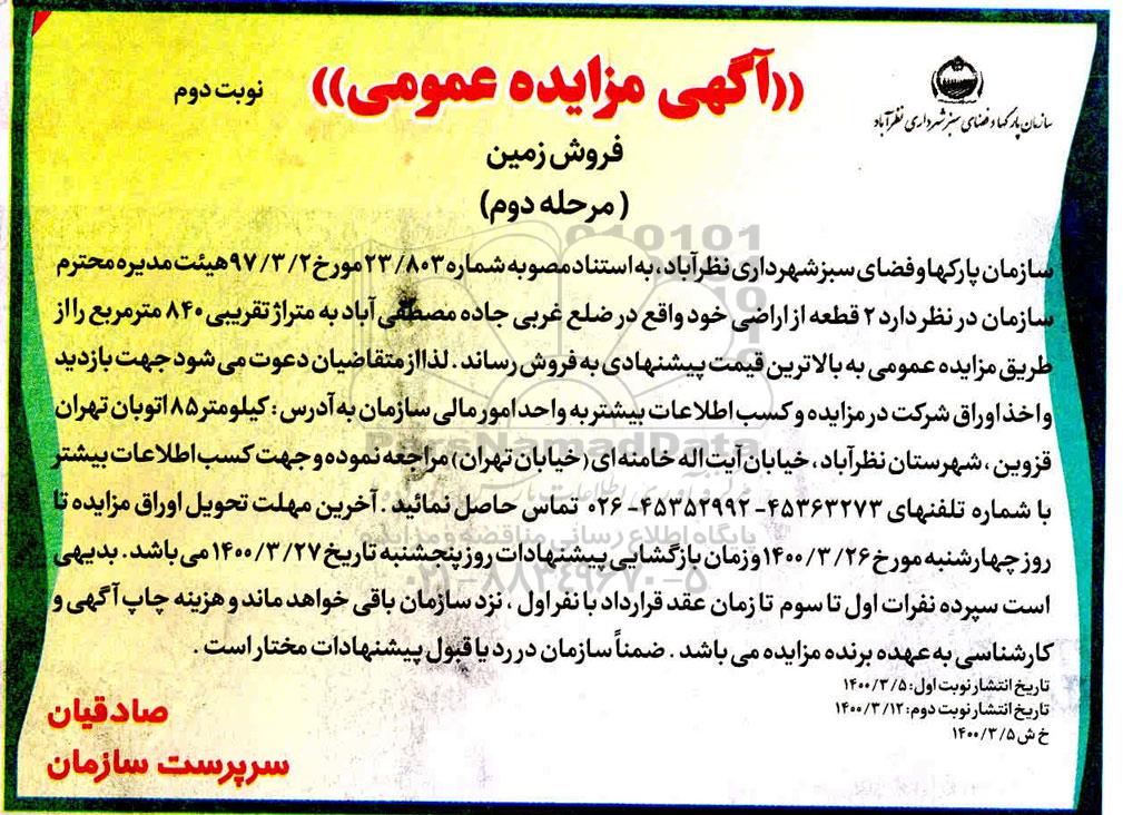 مزایده فروش دو قطعه از اراضی 840 مترمربع نوبت دوم مرحله دوم