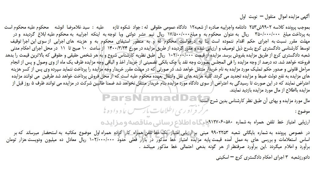 بموجب پرونده کلاسه 9902ش253 دادنامه واجراییه صادره از شعبه12 دادگاه عمومی حقوقی له : جواد شکوه تازه علیه : سید غلامرضا انوشه محکوم علیه محکوم است به پرداخت مبلغ 350/000/000 ریال به عنوان محکوم به و مبلغ17/500/000 ریال نیم عشر دولتی وبا توجه به اینکه اجراییه به محکوم علیه ابلاغ گردیده و در مهلت مقرر نسبت به اجرای حکم اقدام ننموده است بنا به درخواست محکوم له و به منظور استیفای محکوم به و هزینه های اجرایی از سوی این اجرا توقیف توسط کارشناسی دادگستری کرج بشرح ذیل توصیف و ارزیابی شده و مقرر گردیده از طریق مزایده در مورخ 1400/3/24 از ساعت 10 صبح تا 11 در محل اجرای احکام مدنی شعبه دادگستری کرج از طریق مزایده بفروش برسد. مزایده از قیمت 102/000/000 ریال طبق نظریه کارشناس شروع و به هر شخص حقیقی و حقوقی که بالاترین قیمت را بدهد فروخته خواهد شد. ده درصد از وجه مزایده را فی المجلس بصورت وجه نقد یا چک بانکی تضمینی از خریدار اخذ و الباقی وجه مزایده ظرف یک ماه از وی وصول و پس از انجام مراحل قانونی و صدور حکم تملیک مورد مزایده به نام خریدار منتقل خواهد شد. در صورتی که در مهلت مقرر خریدار وجه مزایده را پرداخت ننماید سپرده وی پس از کسر هزینه های مزایده به نفع دولت ضبط و مزایده تجدید می گردد. کلیه هزینه های نقل وانتقال بعهده محکوم علیه است که از محل فروش پرداخت خواهد شد طرفین می توانند مزایده اعتراض نمایند که در این صورت تا رسیدگی به اعتراض از سوی دادگاه مورد مزایده بنام خریدار منتقل نخواهد شد ضمنا طالبین شرکت در مزایده می توانند ظرف 5 روز قبل از مزایده بااطلاع از مال مورد مزایده بازدید نمایند.