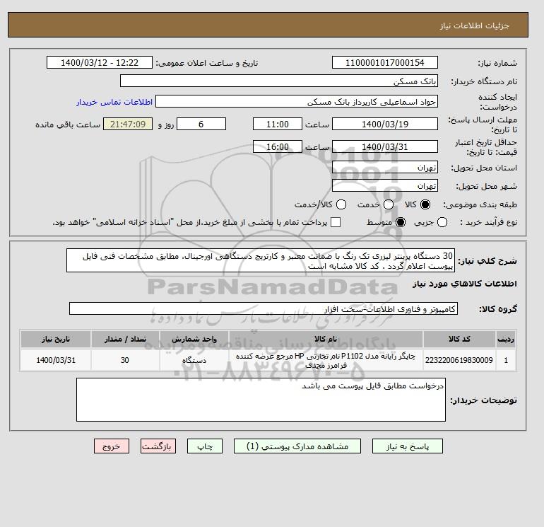 شرح کلی نیاز: 30 دستگاه پرینتر لیزری تک رنگ با ضمانت معتبر و کارتریج دستگاهی اورجینال، مطابق مشخصات فنی فایل پیوست اعلام گردد . کد کالا مشابه است