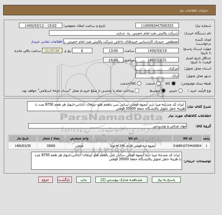 شرح کلی نیاز: ایران کد مشابه میبا شد آبمیوه قوطی سانی نس باطعم هلو -پرتغال- آناناس-انبهاز هر طعم 8750 عدد با هزینه خمل تحویل پالایشگاه جمعا 35000 قوطی