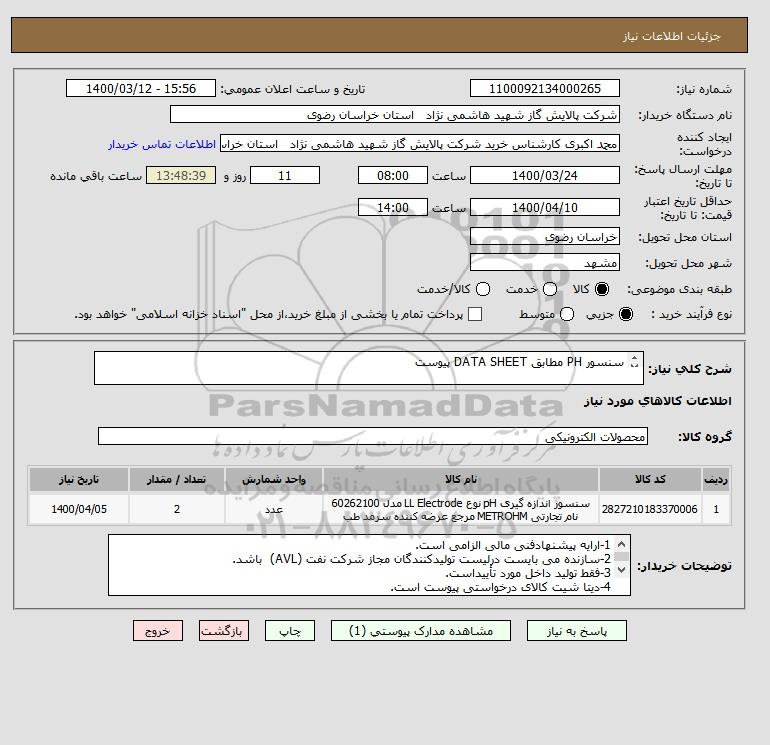 نام دستگاه خریدار:شرکت پالایش گاز شهید هاشمی نژاد استان خراسان رضوی