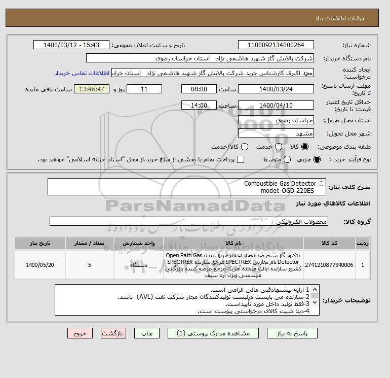 شرح کلی نیاز: Combustible Gas Detector model: OGD-220ES MFR:\ prella operating voltage: 100-220V AC,50HZ